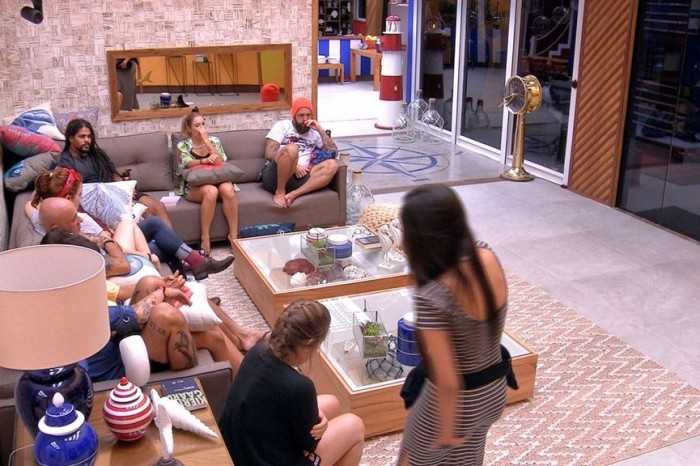 Os confinados se reúnem na sala após chamado e aviso sonoro. O trio Diego, Patrícia e Ana Paula, que estava no Bangalô do Líder, se junta aos brothers que já estavam no sofá desde a pegadinha com Caruso.