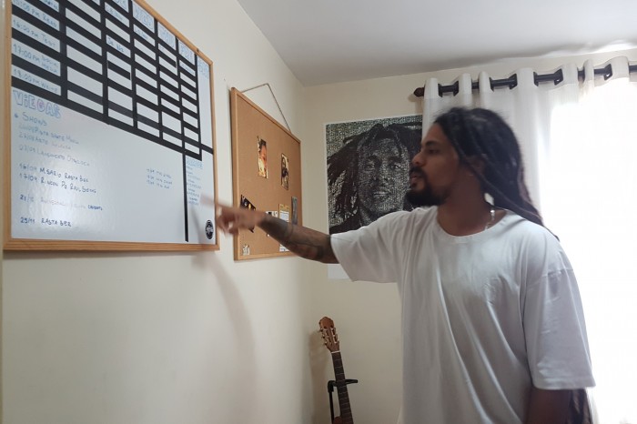 Morador da Cohab Juscelino, localizada na Zona Leste de São Paulo, Viegas, de 33 anos, é motivo de orgulho para sua mãe, Dona Marina, pelas escolhas que fez na vida. “A gente tem dois caminhos a seguir o do bem e do mal, e muitos jovens foram para o caminho do mal aqui”. Viegas escolheu o primeiro, se encontrou na música e há 7 anos sobrevive de sua arte. Para complementar a renda, vende seus CDs pelas ruas da cidade. “Mesclo muito o reggae e rap. O reggae tem uma identidade muito grande na minha vida. Mas o questionamento e a poesia do rap me chamam muita atenção, por ser mais séria, mais dura. São dois gêneros que sou apaixonado e o fio condutor está aí”, explica.